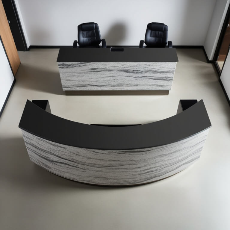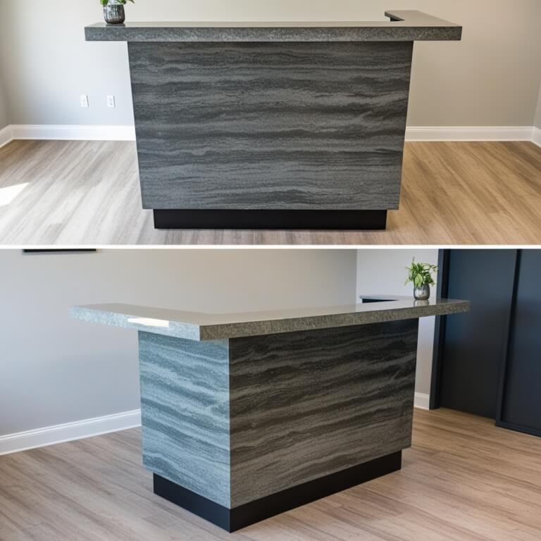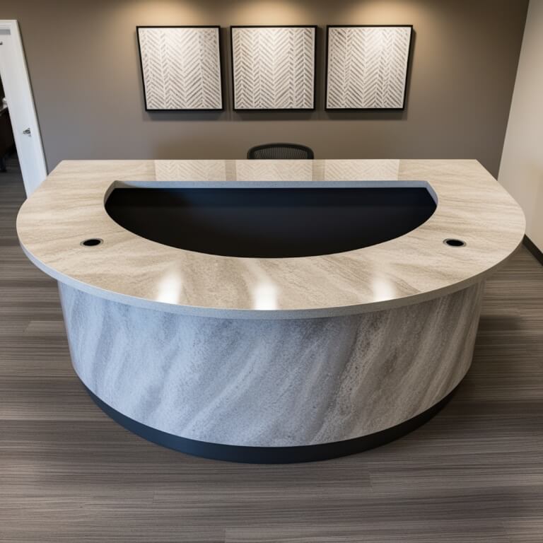 Introducing the Everest Quartzite Reception Desk, a stunning fusion of elegance and functionality designed to make a lasting impression in any professional setting. Crafted from premium quartzite, this reception desk features a distressed finish that exudes sophistication while ensuring durability. The desk’s cementitious base material provides a robust foundation, making it a perfect centerpiece for your reception area. With its generous dimensions and exquisite design, the Everest Quartzite Reception Desk is not just a piece of furniture; it is a statement of style and professionalism.