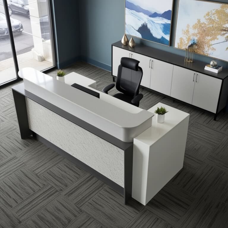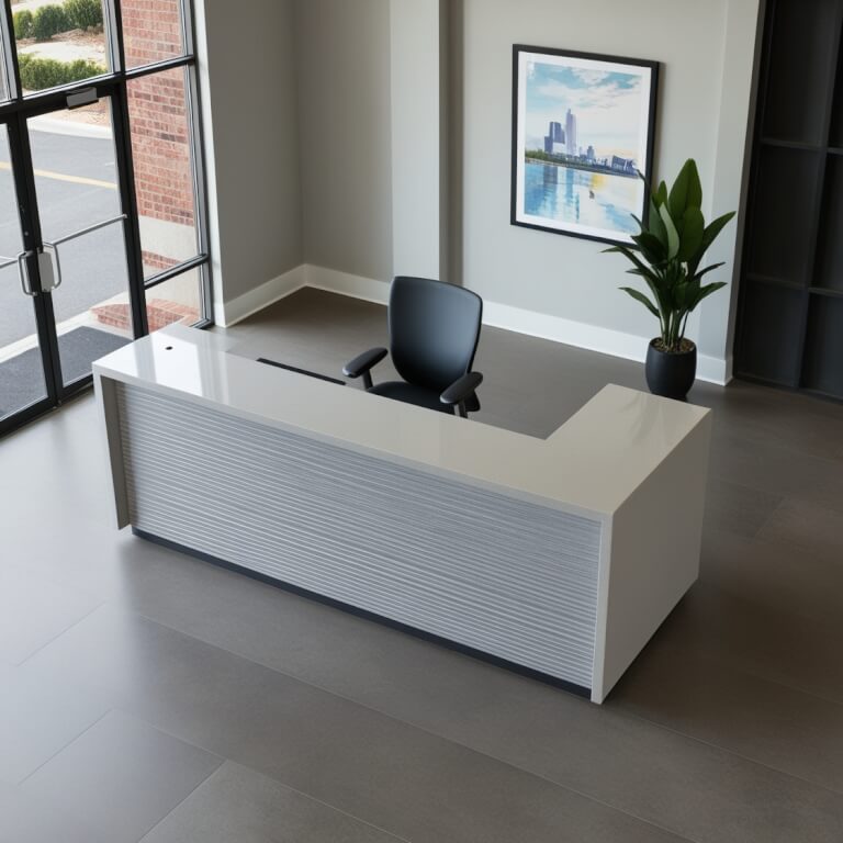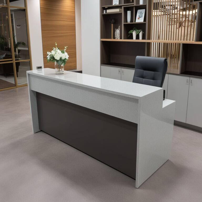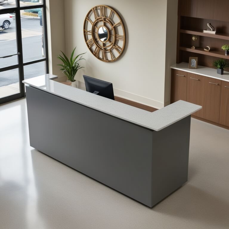 Introducing the LG Viatera Montclair Quartz Reception Desk, a stunning fusion of elegance and functionality designed to elevate any reception area. Crafted from premium engineered quartz, this desk boasts a glossy finish that radiates sophistication while ensuring durability. The Montclair’s sleek lines and modern aesthetic make it the perfect centerpiece for welcoming guests and clients, creating an inviting atmosphere that reflects professionalism and style.
