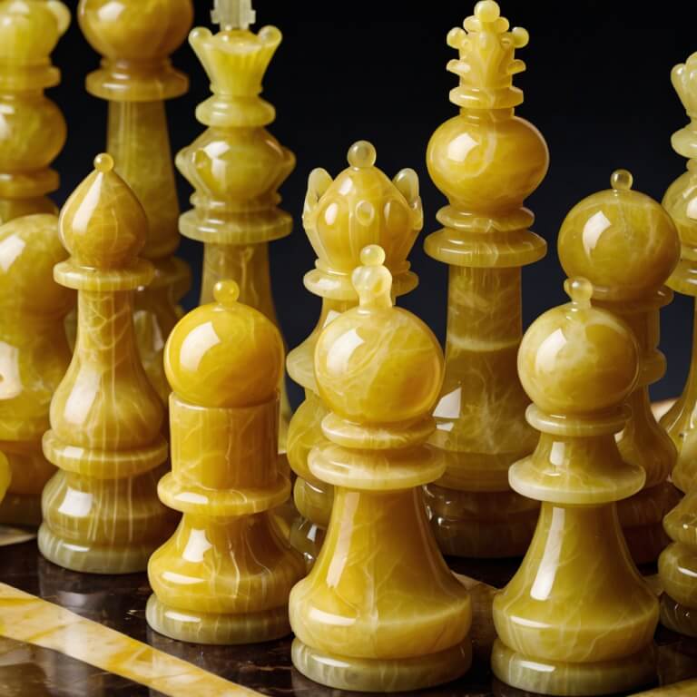 Шахматный набор из лимонного оникса — это элегантное сочетание искусства и стратегии. Каждая фигура выполнена из высококачественного оникса, обладающего уникальным желтым оттенком и красивыми прожилками. Набор включает в себя классную доску и тщательно проработанные фигуры, что делает его идеальным для коллекционеров и любителей шахмат. Этот набор станет не только отличным игровым аксессуаром, но и стильным элементом интерьера.